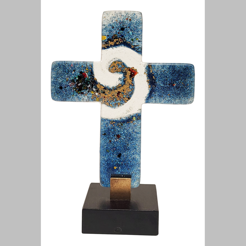 Glaskreuz auf Holzsockel, Blau, 12 x 10 cm890186