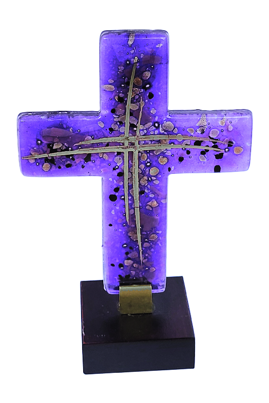 Glaskreuz auf Holzsockel, blau/silber,14 cm hoch890194