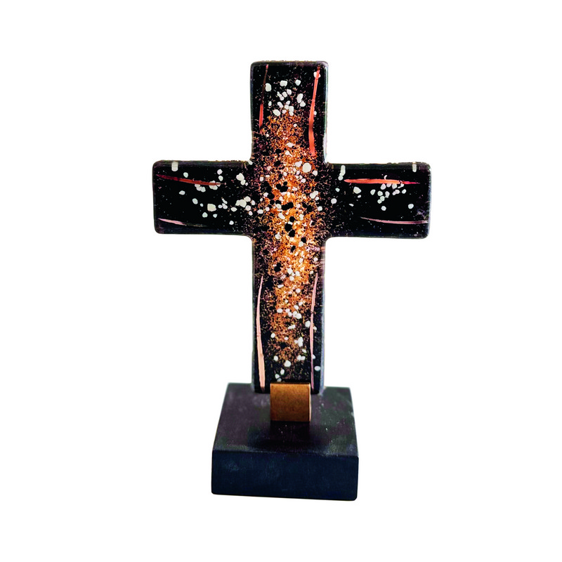 Glaskreuz auf Holzsockel, schwarz/gold,14 cm hoch890193